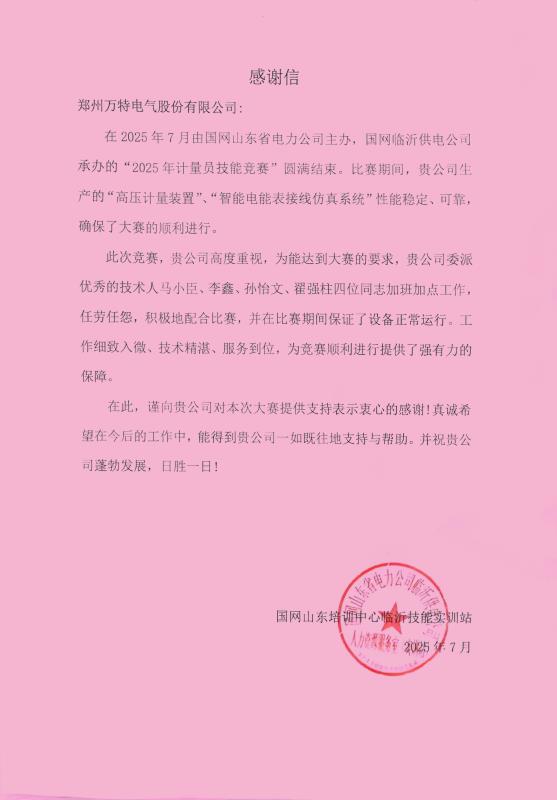 2025年7月,由國網(wǎng)山東省電力公司主辦、國網(wǎng)臨沂供電公司承辦的“2025年計量員技能競賽”在臨沂圓滿落幕。公司為本次競賽提供的競賽用產(chǎn)品憑借穩(wěn)定可靠的性能,保障了大賽的順利進行,獲得主辦方高度評價。